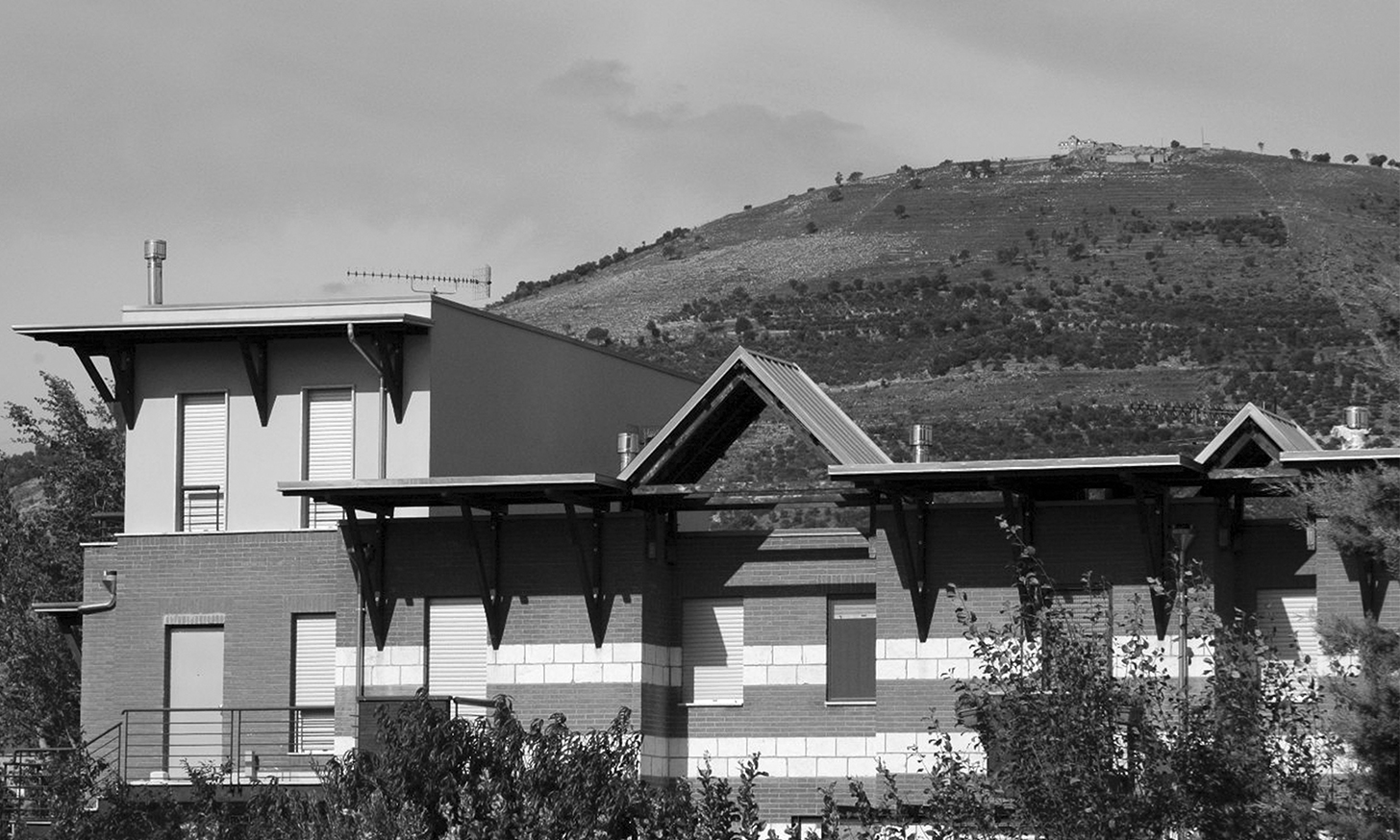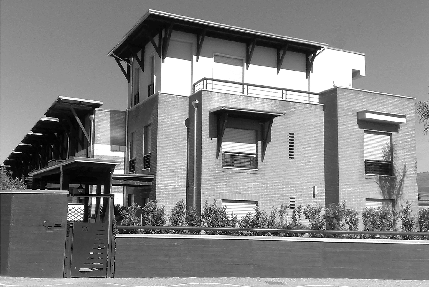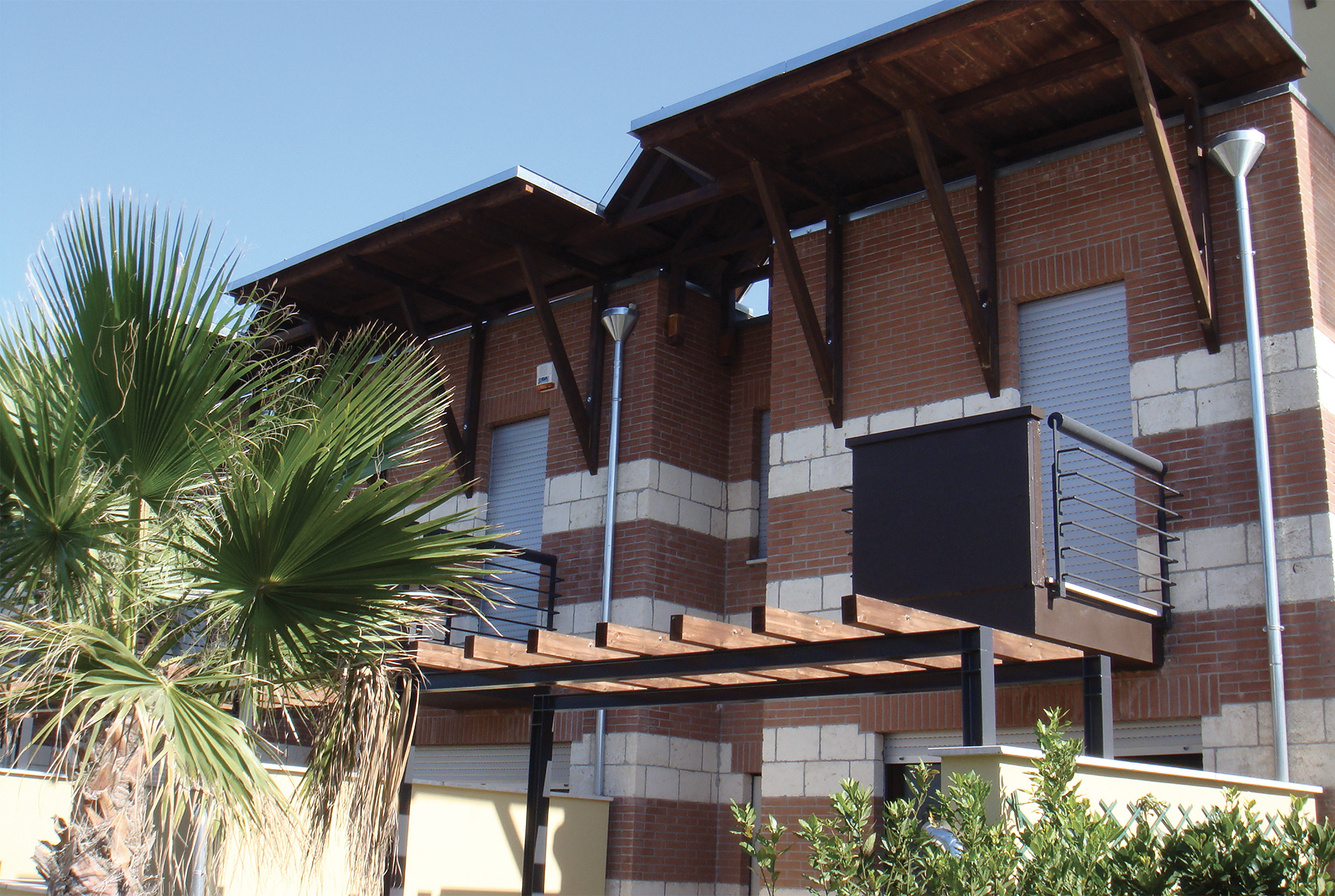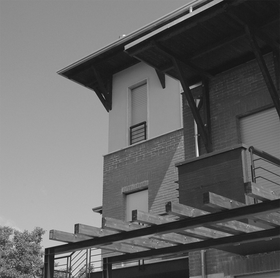 STRUTTURA IN CEMENTO ARMATO, RIVESTIMENTO IN MATTONI FACCIA A VISTA, INFISSI IN LEGNO A DOPPIO VETRO CAMERA, COPERTURA PIANA IN LEGNO.
