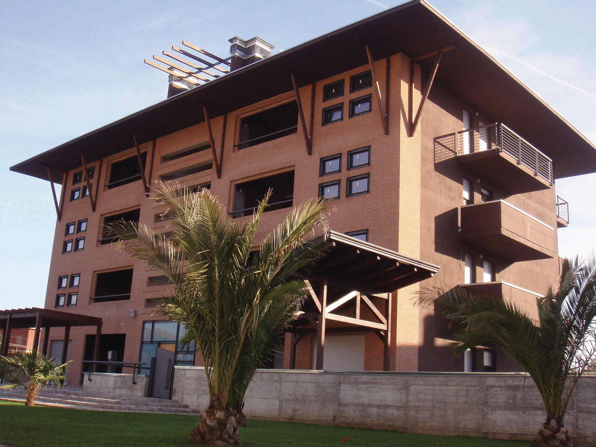 STRUTTURA IN CEMENTO ARMATO, RIVESTIMENTO IN MATTONI FACCIA A VISTA, INFISSI IN LEGNO A DOPPIO VETRO CAMERA, COPERTURA PIANA COIBENTATA.