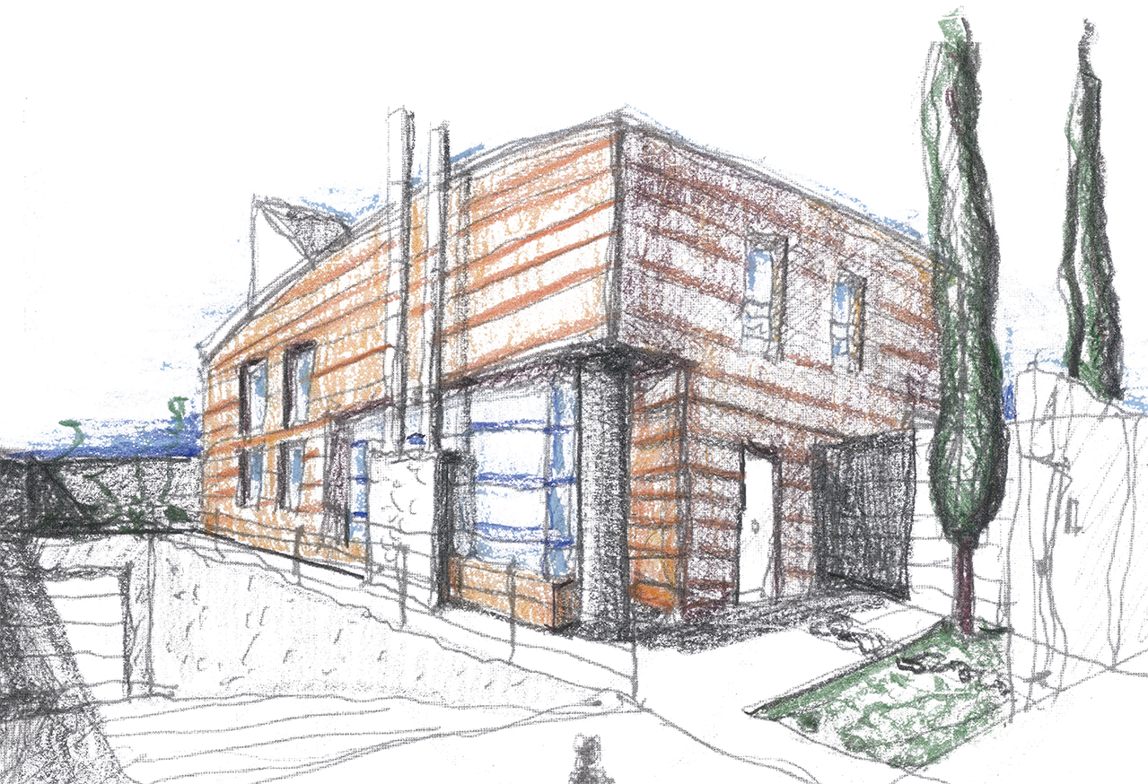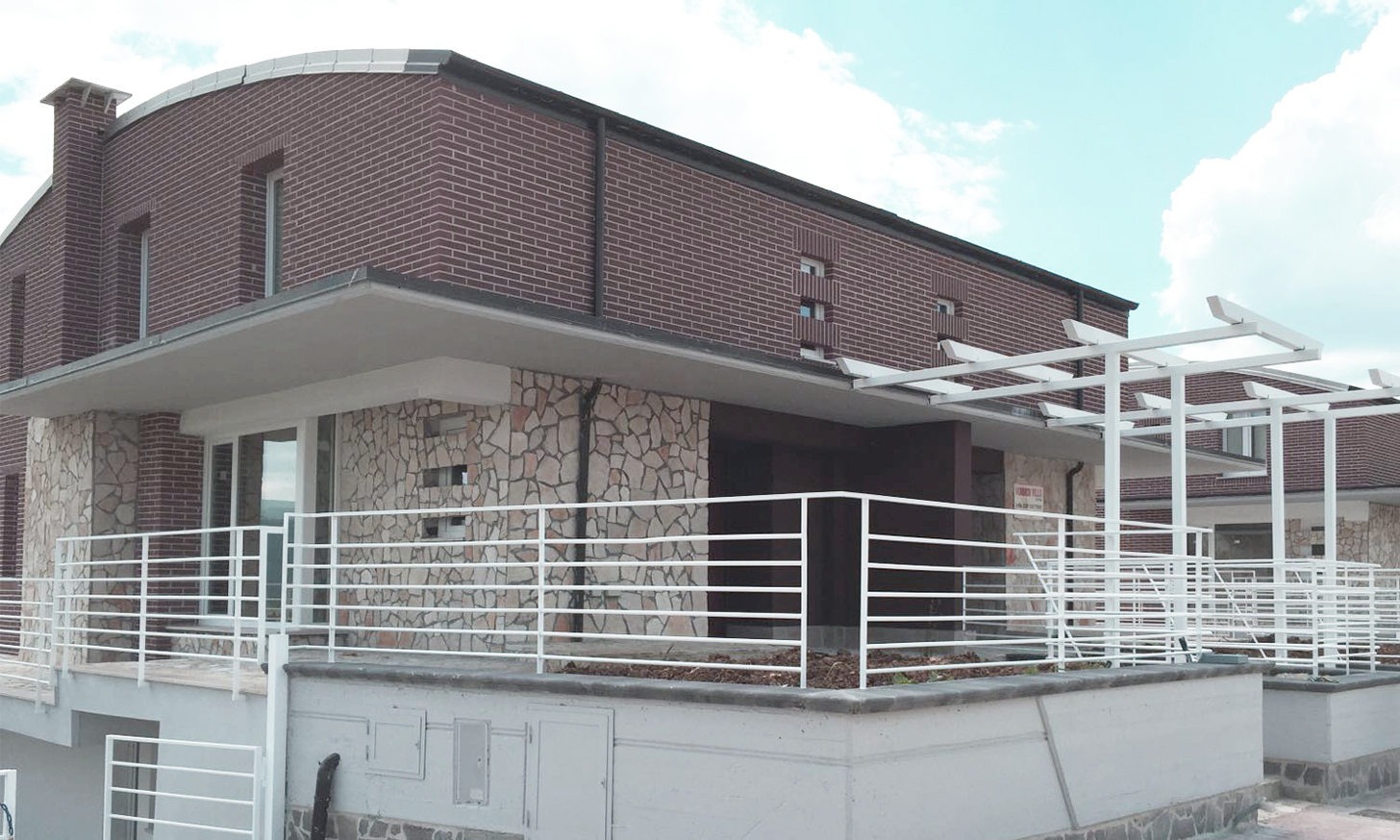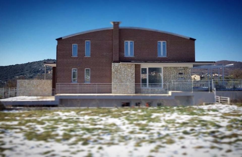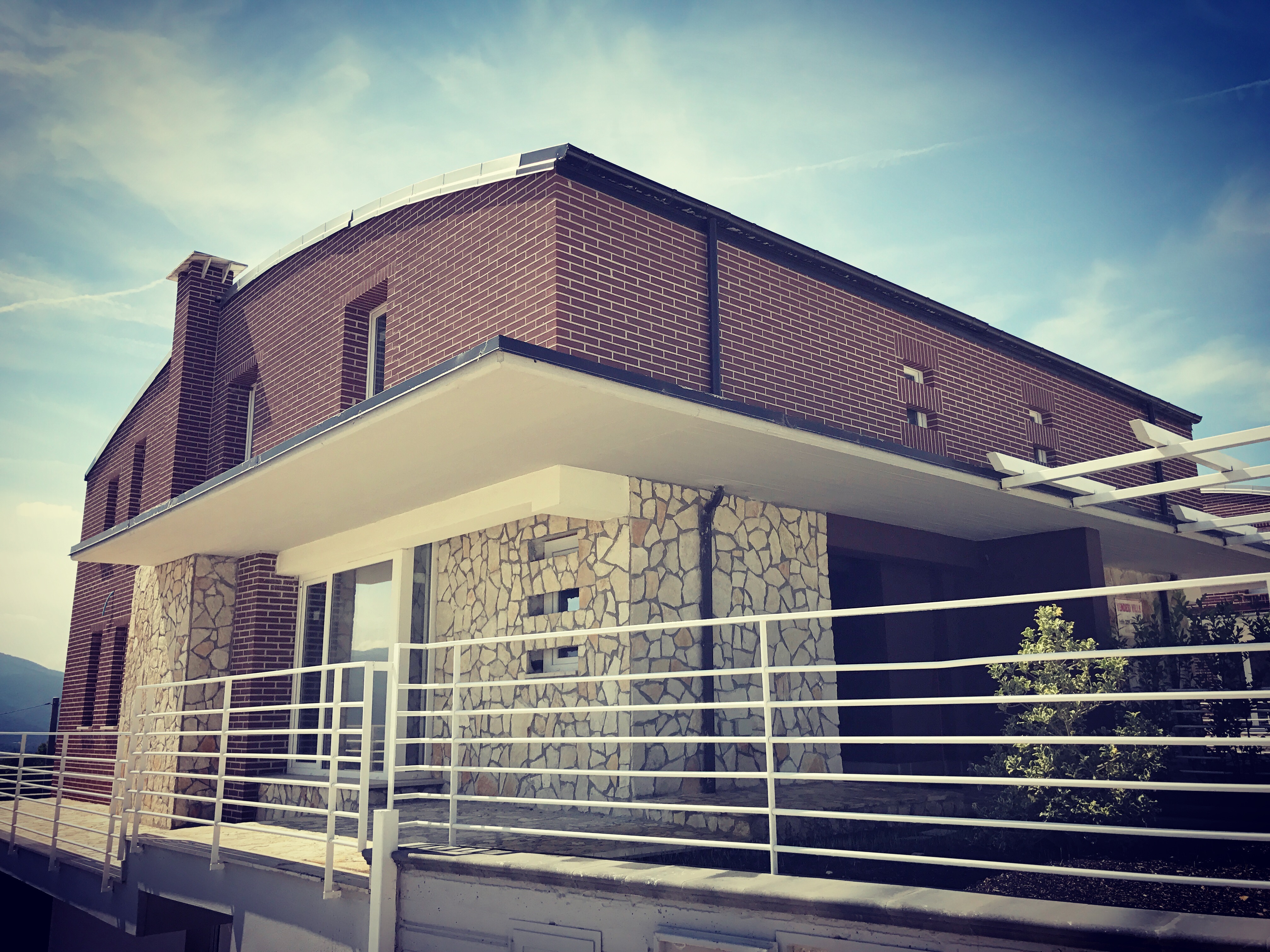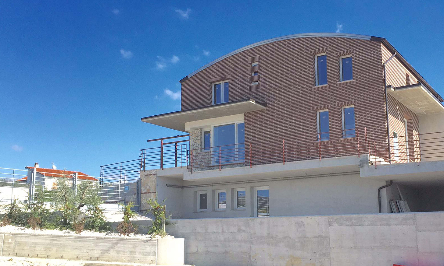 STRUTTURA IN CEMENTO ARMATO, RIVESTIMENTO IN MATTONI FACCIA A VISTA, INFISSI IN PVC A DOPPIO VETRO CAMERA, COPERTURA CON TETTO ONDULIT VENTILATO.
